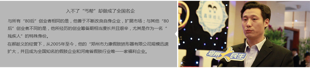 鄭州市力康假肢矯形器有限公司(簡稱力康),是一家專業(yè)從事假肢矯形器的設(shè)計、研發(fā)、制作及裝 配的專業(yè)機構(gòu)。成立于1992年是河南省唯一一家福利企業(yè)。力康下設(shè)業(yè)務(wù)部、技術(shù)部、住院部、康復(fù) 部、售后服務(wù)部,并配有現(xiàn)代化的裝配車間和功能齊全的訓(xùn)練大廳,為殘疾朋友康復(fù)訓(xùn)練提供了可靠 保障??偨?jīng)理穿戴假肢多年,有著豐富的臨床經(jīng)驗和親身體會;多年來,力康已為全國幾十萬名殘疾 朋友安裝上舒適、美觀、耐用的假肢和矯形器具,使他們更大限度地恢復(fù)了正常的工作和生活?!爱a(chǎn) 品即人品”的質(zhì)量理念、先進的技術(shù)、實惠的價格、完善的售后服務(wù)是力康取勝的法寶……
